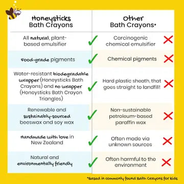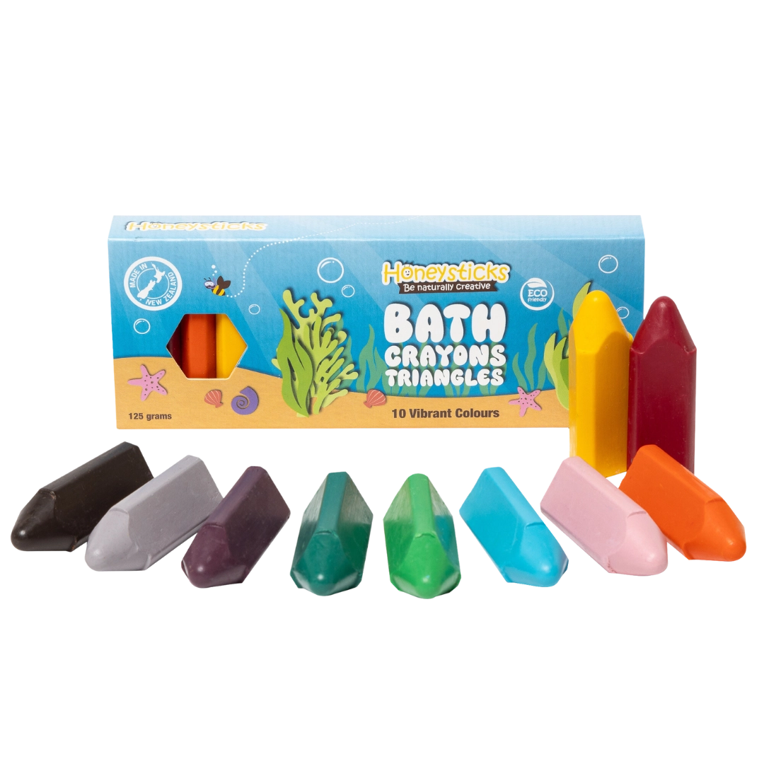 Bring eco-friendly fun to bathtime with Honeysticks Bath Crayon Triangles! Handcrafted in New Zealand from pure beeswax and soy wax, these non-toxic crayons are free from harmful paraffin wax and industrial pigments for purity you can trust.