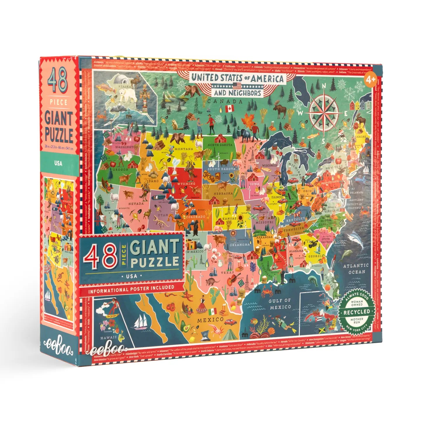 A carefully researched and beautifully designed pictorial map of the U.S.A and its neighbors, brimming with icons by Uta Krugmann offering information about natural and cultural landmarks, industry, agriculture, and wildlife. Includes a color poster identifying these icons. An accessible, educational puzzle offering lessons in geography and beyond.