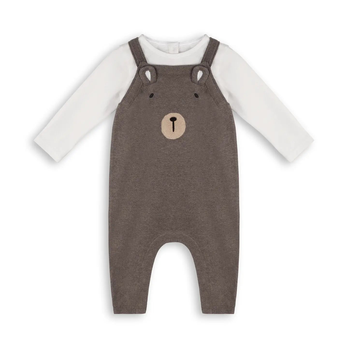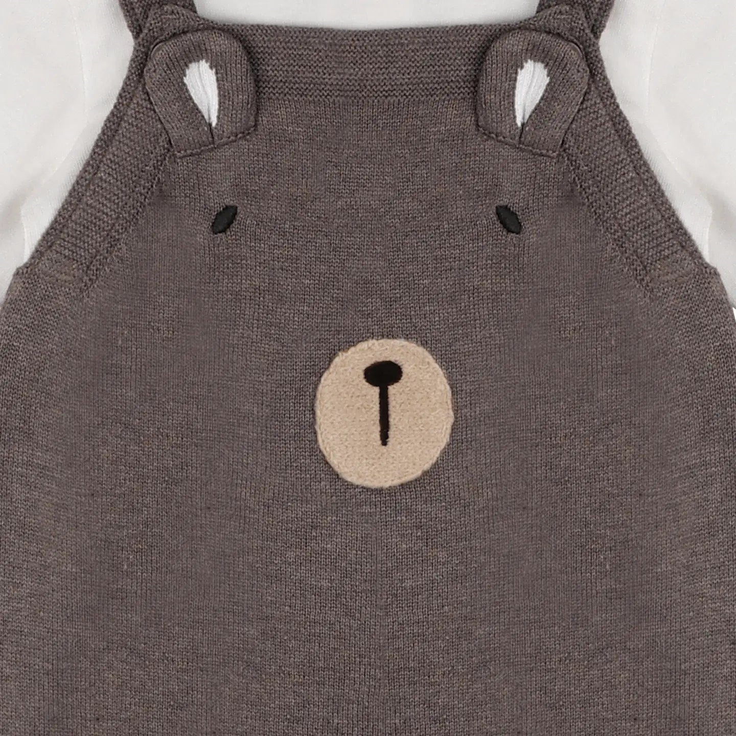 100% organic cotton baby overall set with long sleeve bodysuit, featuring bear face applique and 3D ears in the front.