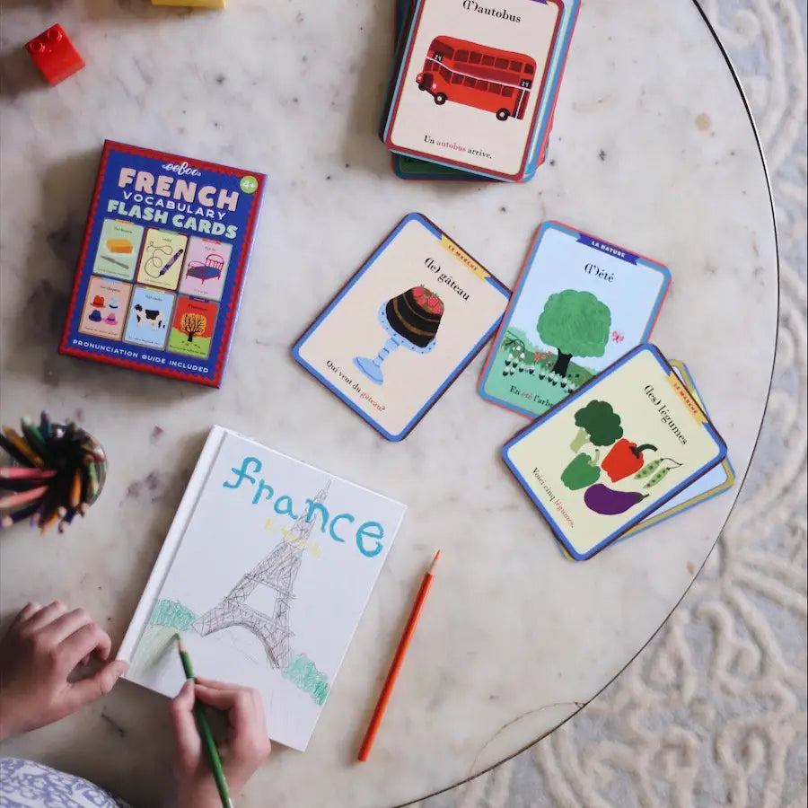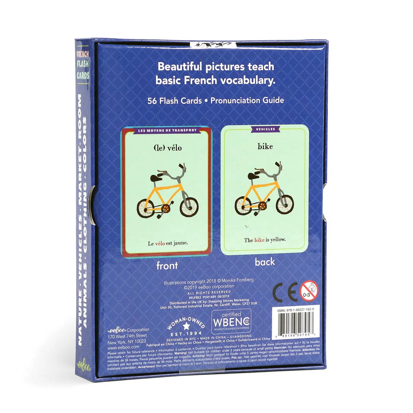 These cards introduce French with eight basic vocabulary words in each of seven categories: nature, vehicles, market, animals, clothing, colors, and home. Each card is printed with the word, an illustration of the word, and the word in a sentence. In French on one side of the card and in English on the reverse. Directions as well as suggestions for using the cards as starting points for storytelling and play acting, and honing categorization skills are included. Illustrations by Monika Forsberg.